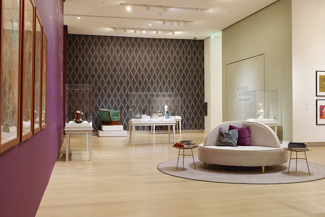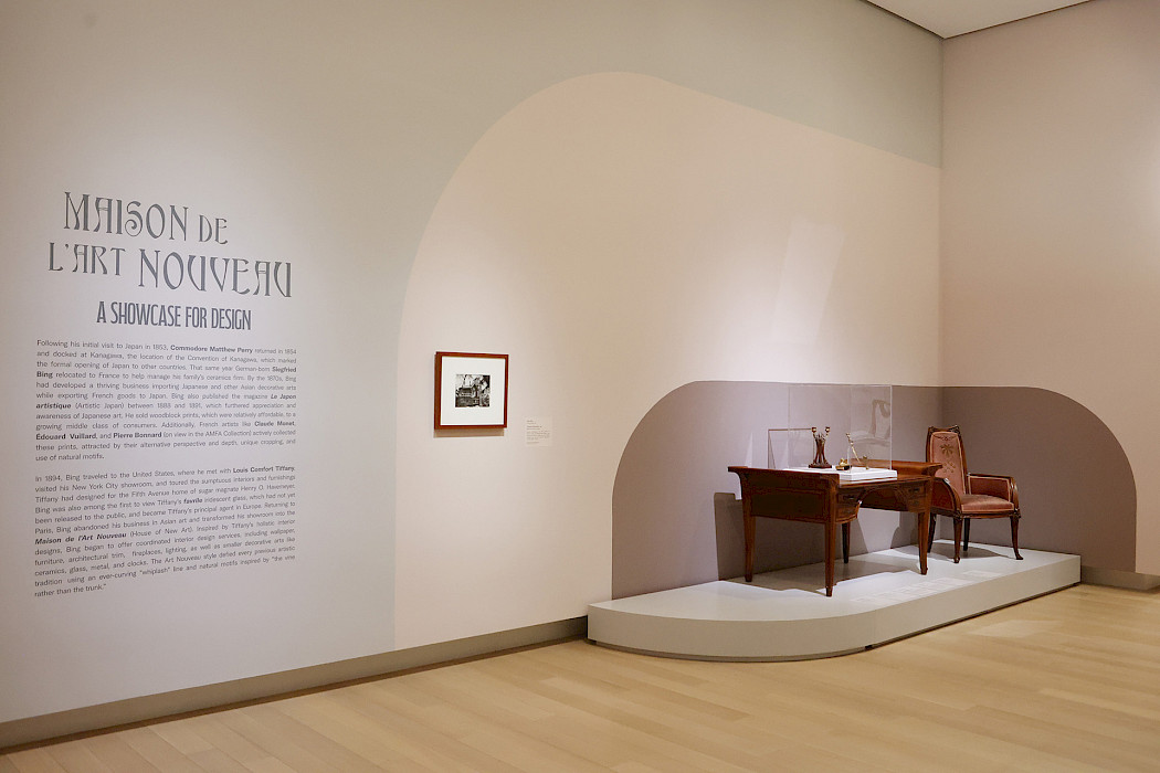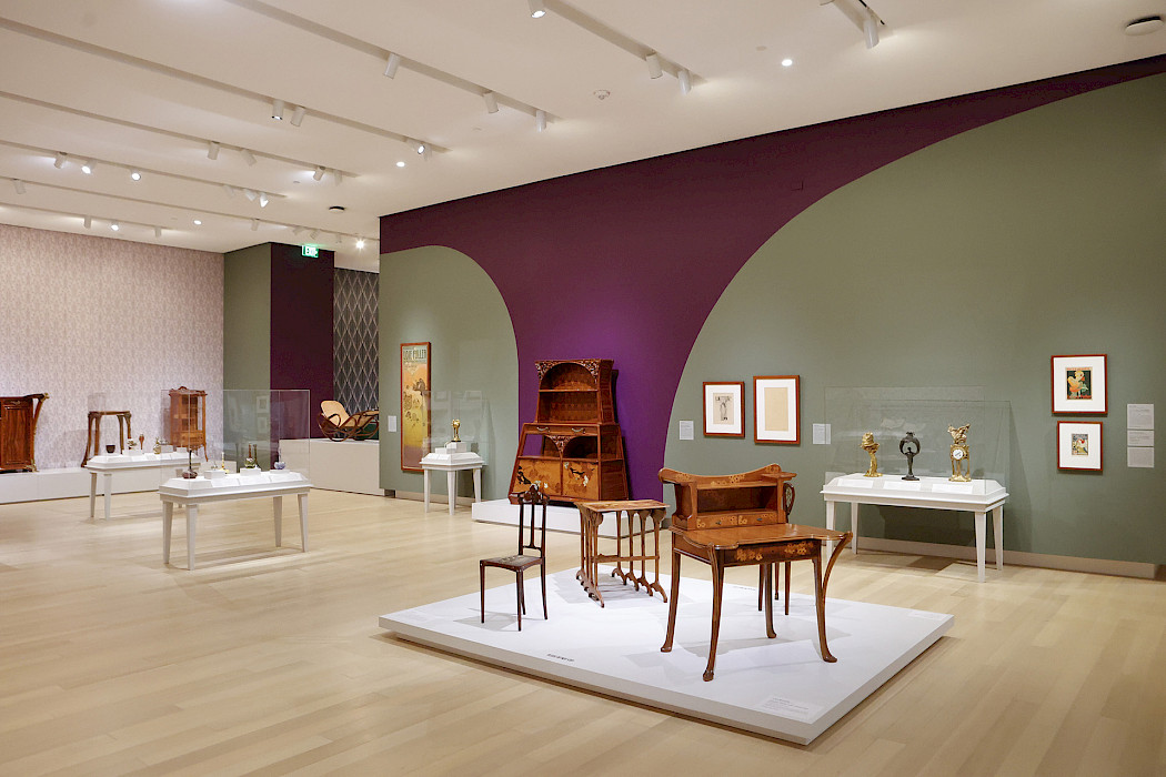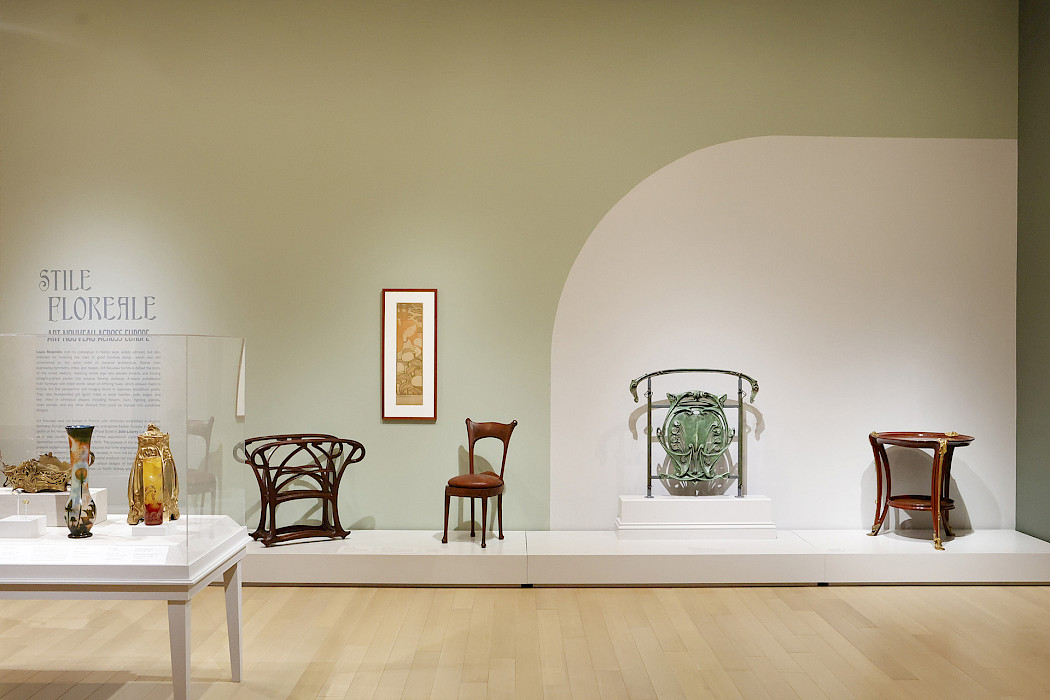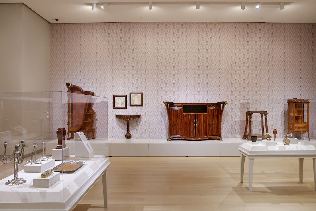 Among these were furniture by Louis Majorelle and Georges de Feure, glass by Emilé Gallé, ceramics by the Zsolnay factory in Hungary, and prints by Czech artist Alphonse Mucha, among others. Designing for a range of clients and settings, including domestic and commercial interiors, these artists fashioned their diverse works to complement each other in harmonious visual arrangements, conceiving of Art Nouveau as a holistic and immersive environment or “total work of art” (Gesamtkunstwerk).