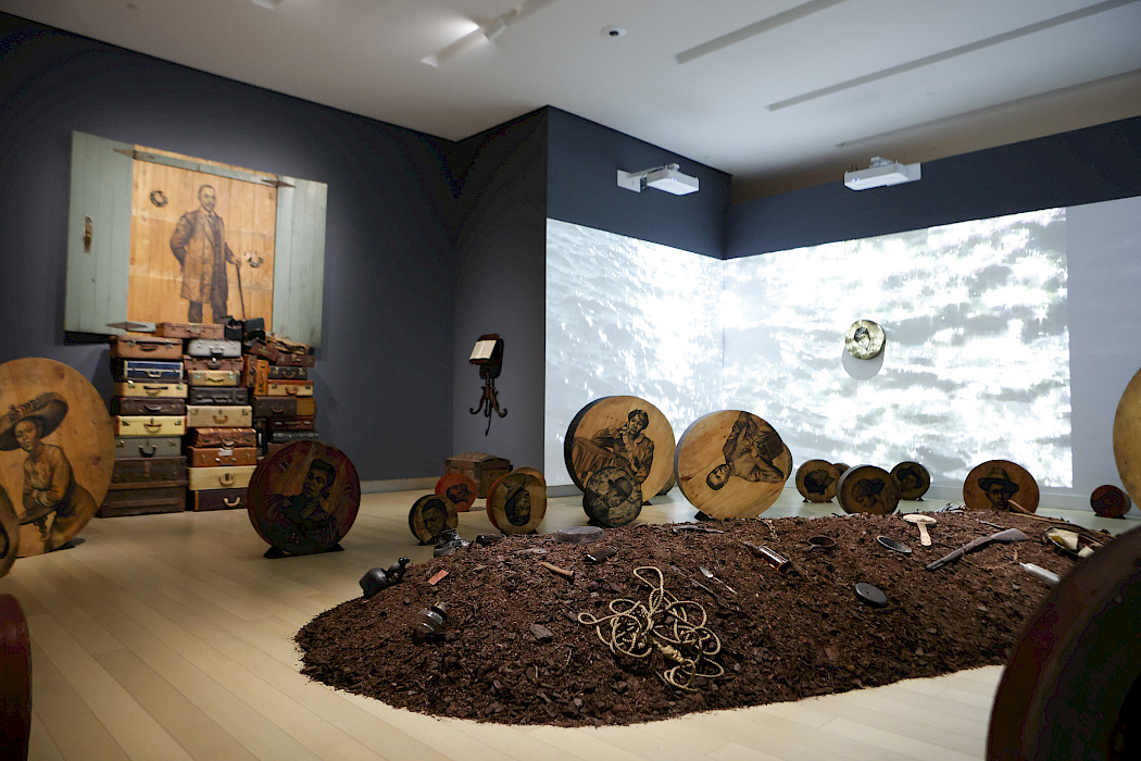 Whitfield Lovell (New York, New York, 1959 – ), Deep River, 2013, installation with fifty-six wooden discs, found objects, soil, video projections, and sound, 198 x 600 x 600 in., Courtesy of the artist and DC Moore Gallery, New York. Image courtesy of Jason Masters.