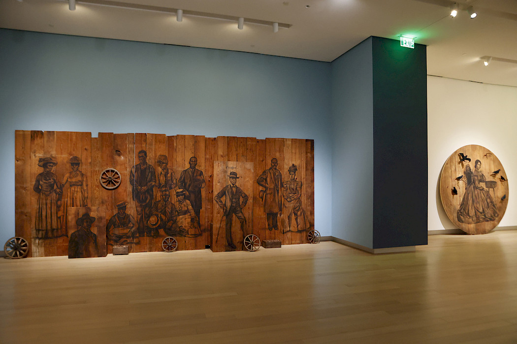 Visitation: The Richmond Project (2001) is a domestic interior displayed in a room built inside the Harriet and Warren Stephens Family Gallery. Lovell uses conte crayon to draw on the wooden walls, basing his compositions on old church picnic photographs. Visitation is inspired by the first major entrepreneurial African American community that settled in Jackson Ward, Richmond, Virginia in the 1860s, specifically Maggie L. Walker, the founder of the Saint Luke Penny Savings Bank and the first Black woman to charter and serve as president of an American bank.