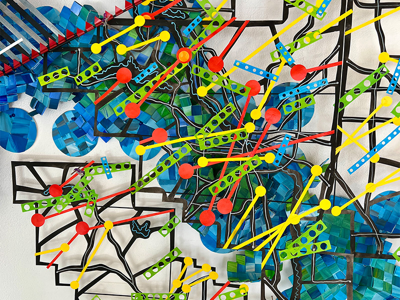 Boston-based artist Nathalie Miebach creates innovative installations that intersect art and science. She deeply researches and tracks data connected to weather patterns and natural disasters to explore their impact on people’s lives. Like a scientist, Miebach gathers research and creates data sets, translating the information into colorful, playful, and even hopeful installations made from painted paper, wood, and other various materials. Miebach distills the scientific complexity behind her work to reveal human stories of resilience and ingenuity in the face of our changing environment.