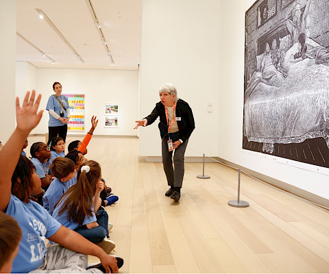 Docent-led museum tours teach students in grades K through 12 how to interpret and discuss art on view in the galleries in a fun and engaging way. Each tour covers three to four artworks and is scheduled to last approximately 45 minutes to one hour. These tours align with Arkansas K-8 and Visual Art Foundations I-IV Visual Art Standards RE.7, RE.8, PR.6, and CN.11, along with other standards, depending on the tour’s theme.