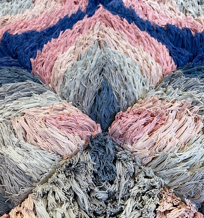 Risa Hricovsky (born 1985, Toledo, OH) transforms the Robyn and John Horn Gallery with a site-specific sculpture and wall-painting installation combining joyful colors, abstract patterns, and materials that fool the eye. The artist creates her intricately patterned “shag rug” sculptures, from which her Fringe series derives its name, using colored porcelain. Associated with midcentury domestic décor, for Hricovsky these rugs also furtively evoke 1960s counterculture and the call for “peace, love and progressive change.” Rather than soft carpet, however, Hricovsky’s hard porcelain is a nod to how fossilized and unchanged many of those 1960s cultural issues turned out to be. At the same time, the artist’s radical transformation of the gallery suggests idealism is as relevant as ever.