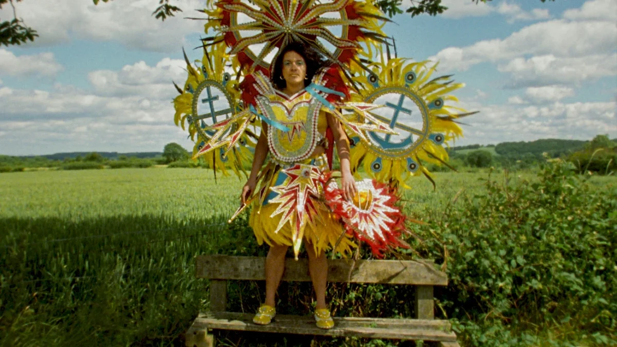 Rhea Storr, an artist of British and Bahamian heritage, examines her identity as a multiracial individual in her short film A Protest, A Celebration, A Mixed Message. Storr (b. 1991, Leeds, England) intersperses contemporary and historical footage of the West Indian Carnival in Leeds, Yorkshire, UK, comparing the ways in which Afro-Caribbean and white people experience the festivities. She contrasts snippets of Black participants dancing and singing in brilliantly colored costumes adorned with feathers, sequins, and ribbons, with shots of white people observing on the sidelines. Storr herself is both an observer and a participant in the revelry—she appears in the video wearing a costume decorated with anchor and sun motifs, symbols of the Bahamas, yet she is also the artist behind the camera, observing and documenting the goings-on. Storr thinks of her camera as another eye—a way to understand what is happening around her. That camera is also a tool to help viewers understand her experience operating simultaneously in two worlds.