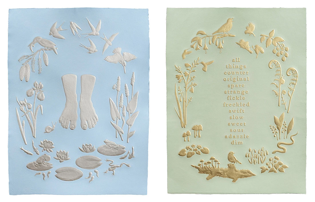 Though conceptualized in Ireland, Wright’s work is created in collaboration with Dieu Donné’s studio in Brooklyn, where Wright works intensively with Master Papermakers to explore her themes. The exhibition presents a selection of these unique objects made from cotton and abaca paper, peat, turf, moss, fungi, lichen, and gold leaf. AMFA has acquired the newest work by Wright, The Naturalist, a large diptych created for this exhibition.