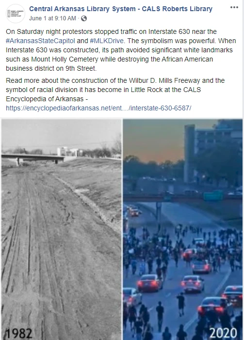 A few weeks ago, protesters marched on Interstate 630 in Little Rock, drawing attention to the history of the highway and the neighborhood it destroyed. Read more about the development of Interstate 630 here.